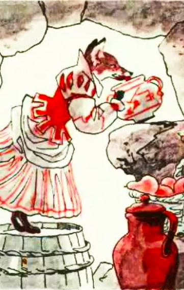 А гусыня тем временем к дыням приглядывалась. Вдруг видит: лиса бежит. Куда тут денешься? Глядит: лежит дыня большая-пребольшая. Пробила гусыня в дыне дыру и залезла внутрь. Стала лиса рыскать по базару, искать гусыню. А потом подумала: «Да, может, она ещё и не пришла». И решила лиса сходить в дынный ряд – выбрать себе дыньку. Откусит от одной, пожуёт другую… Дыни попадались всё горькие, не по вкусу. Вдруг видит лиса: лежит дыня большущая. «Ну, эта уж наверняка сладкая», – подумала лиса и откусила кусок побольше. А у гусыни клюв как раз в этом месте был. Увидела она, что дыня продырявилась, да как плюнет!