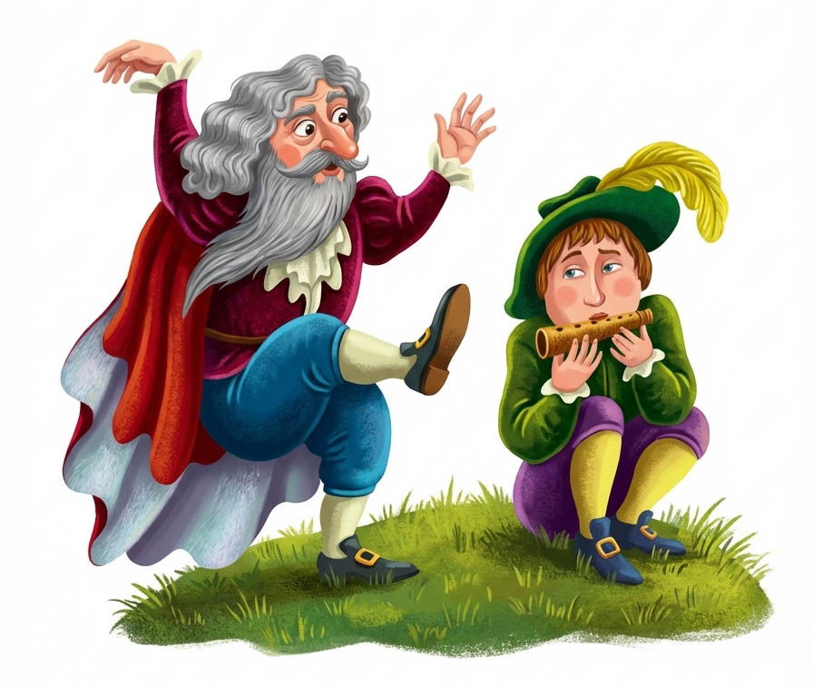 Приплясывая, король кричал, чтобы все немедленно прекратили танцевать. Юноша перестал играть, и все плясуны тут же попадали на пол. Король опять спустился в тюрьму.