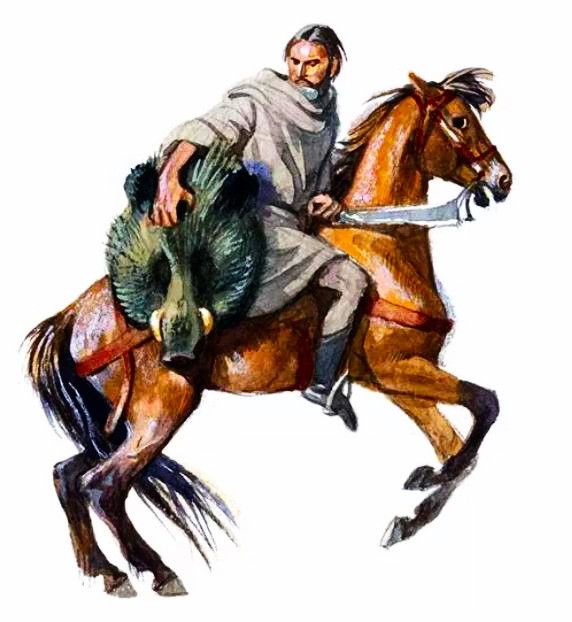 Вернулся лесной человек в чащу, и в скором времени вышел оттуда конюх, он вел коня. Конь фыркал, храпел и его еле можно было удержать. А за ним следовал большой отряд воинов, закованных в броню, и мечи их сверкали на солнце.