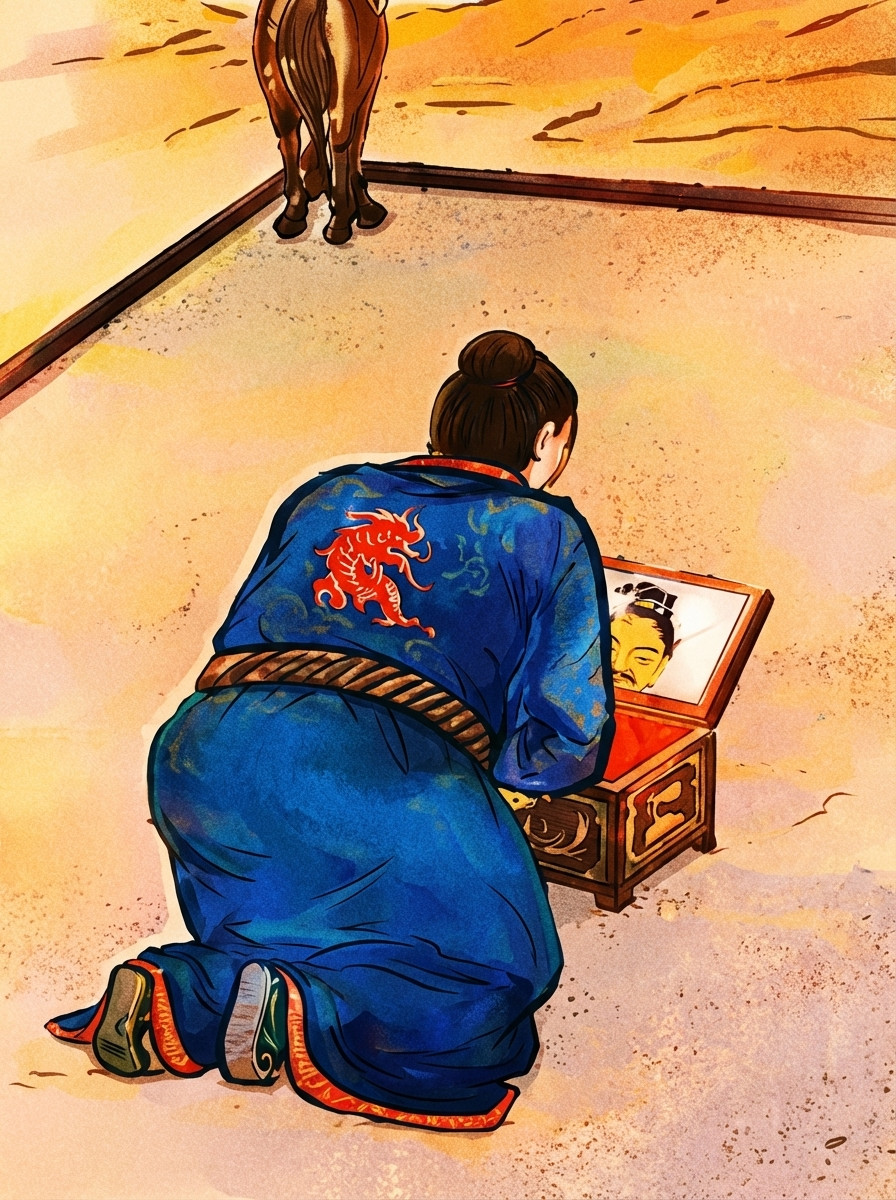 Интикума стал тянуть отца к себе — в Кибы, а Цзин принялся тащить в свою сторону — в Диабей. Всё сильнее и сильнее дёргали сыновья за концы верёвок. Но паучок всё не появлялся. Побежали сыновья к отцу узнать, что же с ним случилось.