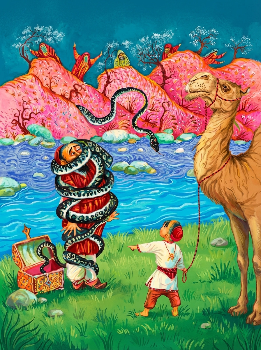 — Ах, чужеземец, — ответил чайханщик, — раньше посередине нашего города протекала большая река. Но однажды пришёл аждарха и улёгся на том месте, откуда река вытекает. Каждый день мы отдавали аждархе девушку на съедение. Когда он её проглатывал, то шевелился и из-под него вытекала вода. Теперь в городе уже не осталось девушек. Завтра к аждархе отведут дочь царя, а после этого мы все умрём от жажды…