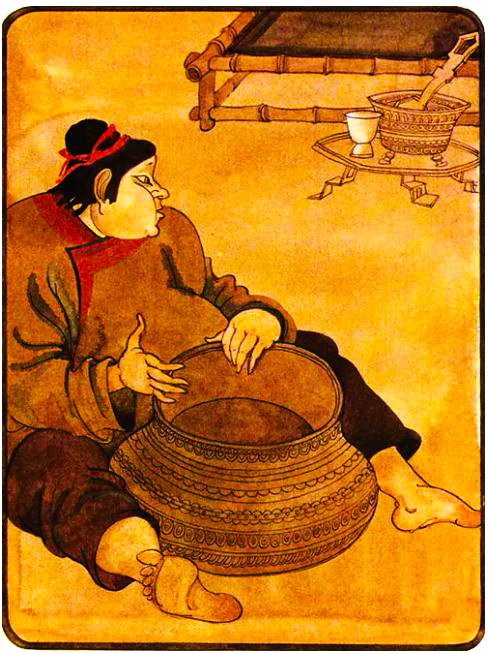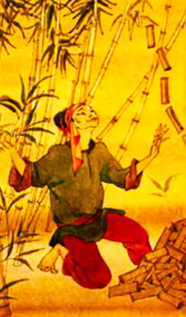 Чего только не приходилось делать бедной девушке! Старейшина заставлял её рубить такие большие деревья, справиться с которыми было под силу лишь самым крепким парням в селении. Когда же созревал рис, хозяин отправлял девушку очищать зёрна с самого раннего утра и до того времени, пока на небе не появится луна.