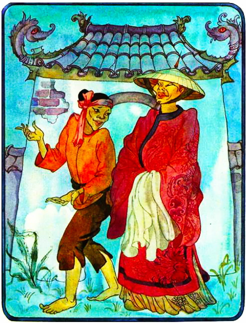 Не успела девушка произнести эти слова, как по правую руку от неё вырос большой просторный дом на сваях. А внизу под домом громко замычали быки и буйволы. В доме девушка увидела развешанные гонги, расставленные медные котлы. Уа глядела и наглядеться не могла на всё это богатство. И вдруг в дом вошёл её любимый Го. Они, счастливые, глядели друг на друга и чуть не плакали от радости.