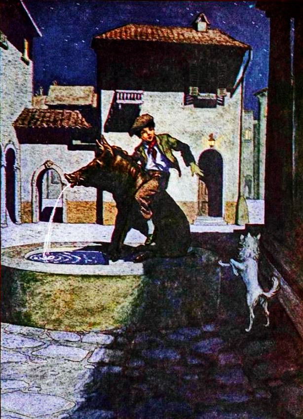 — Держись крепче, малыш, теперь я побегу! — и кабан помчался вскачь. Это была необычайная прогулка. Сперва они попали на пьяцца дель Грандукка, и бронзовая лошадь под герцогом громко заржала, пестрые гербы на старой ратуше стали как бы прозрачными, а Микеланджелов Давид взмахнул пращой; удивительная пробудилась жизнь! Бронзовые группы «Персей» и «Похищение сабинянок» ожили: над пустынной площадью раздались крики ужаса.