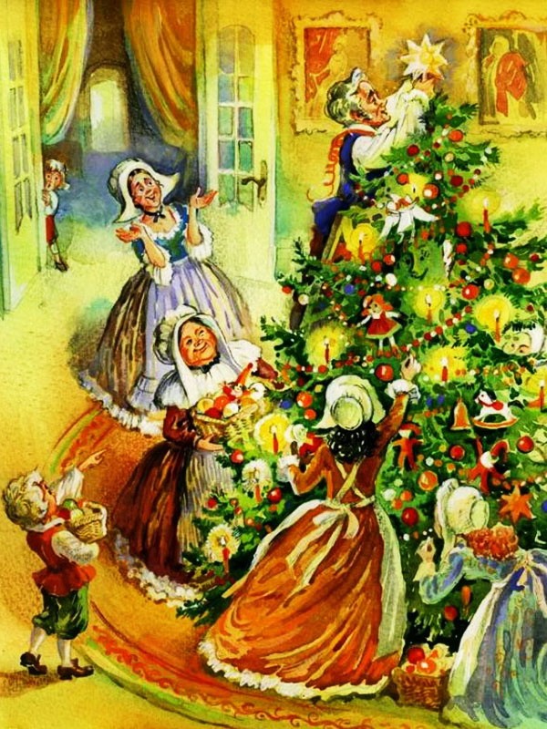 — Ай-ай! — закричали барышни и поспешно затушили огонь. Больше елка дрожать не смела. И напугалась же она! Особенно потому, что боялась лишиться хоть малейшего из своих украшений. Но весь этот блеск просто ошеломлял ее… Вдруг обе половинки дверей распахнулись, и ворвалась целая толпа детей; можно было подумать, что они намеревались свалить дерево! За ними степенно вошли старшие. Малыши остановились как вкопанные, но лишь на минуту, а там поднялся такой шум и гам, что просто в ушах звенело. Дети плясали вокруг елки, и мало-помалу все подарки с нее были посорваны.