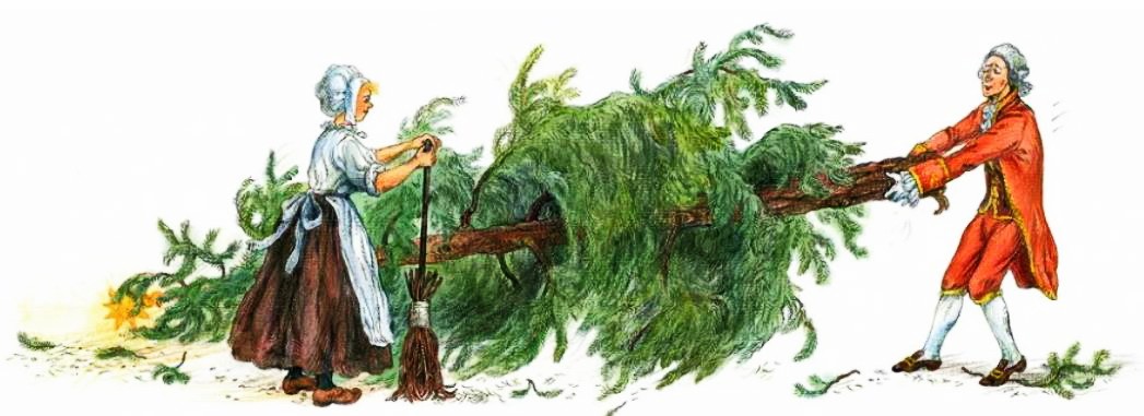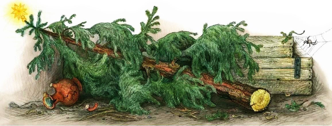 Однажды утром явились люди прибрать чердак. Ящики были вытащены, а за ними и ель. Сначала ее довольно грубо бросили на пол, потом слуга поволок ее по лестнице вниз.