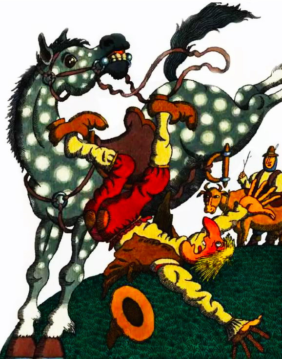 — Ку-ка-ре-ку! — победно закричал петух и только собрался склюнуть первое зерно, как мальчик превратился в лису, бросился на петуха и придушил его.