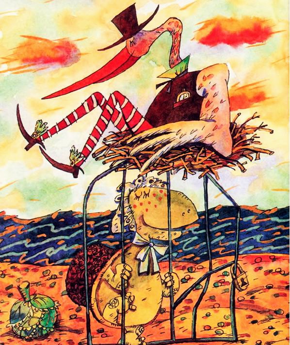 Однажды мимо острова пролетал голодный аист Чарли. Увидев, что Розалинда одна, он подумал: