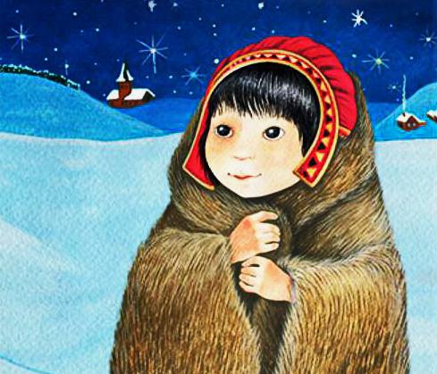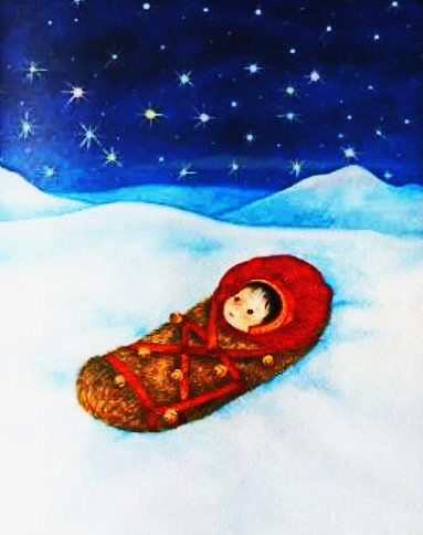 Младенец лежал в снежном сугробе, закутанный в оленью шкуру, и смотрел на звезды. Волки вмиг оказались возле него, а он не мог шевельнуть ни рукой, ни ногой, мог лишь только глядеть на них. Он не плакал, а только лежал не двигаясь и смотрел. В невинных глазах младенца скрыта удивительная сила. Голодные хищники остановились и не посмели его тронуть. Они постояли немного неподвижно, глядя на ребёнка, словно онемев от изумления, потом помчались изо всех сил по оленьему следу продолжать охоту.