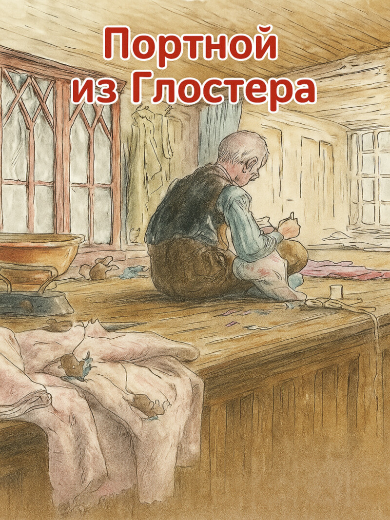 Сказка про старого и бедного портного из города Глостера. Он должен был сшить к Рождеству костюм для мэра. Портной раскроил костюм, сколол его булавками и осталось только сшить. Но у него не хватило шелкового шнура вишневого цвета.