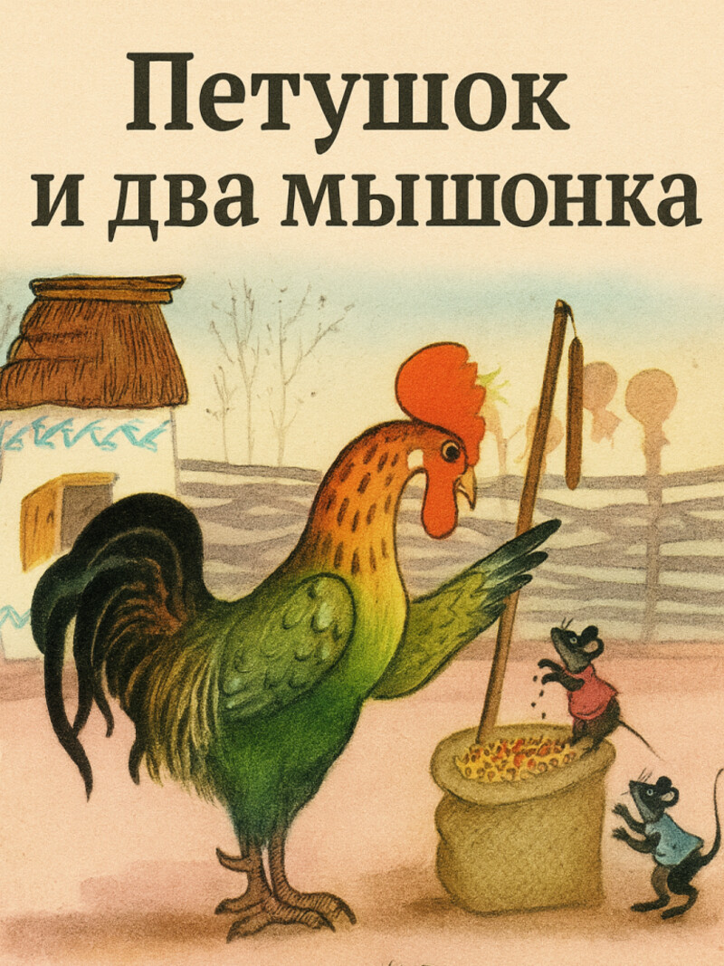 Сказка про двух ленивых мышат и петушка. Петушок просил их помочь, но мышата целый день только и делали, что крутились и вертелись. Поэтому и пирога не получили.