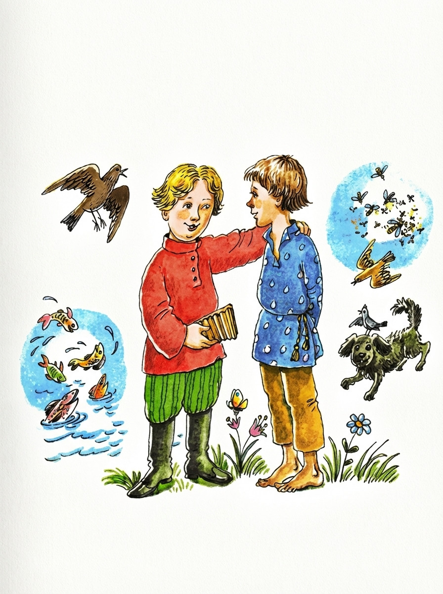 Сказка про двух друзей, один из которых был бережливый и каждую копеечку в копилку складывал, а другой - наоборот. Как только появится у него пятак или гривенник, обязательно чего-нибудь да купит. Но один случай показал, что бережливым быть хорошо, а добрым лучше.
