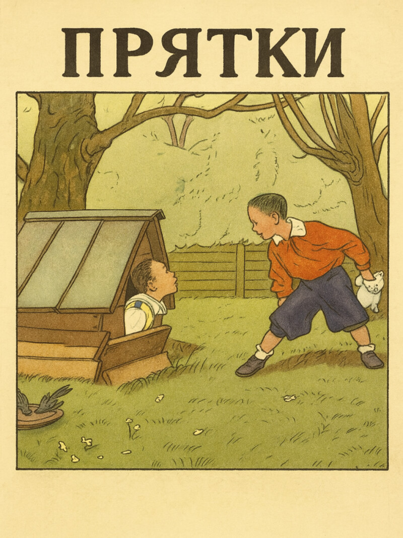 Рассказ о двух приятелях - Славике и Вите. Однажды они задумали поиграть в прятки. Витя стал прятаться, а Славик его быстро находил. Витя обижался и каждый раз перепрятывался. Наконец, Славику надоело искать Витю, он закрыл его в шкафу и побежал во двор с собачкой Бобиком….