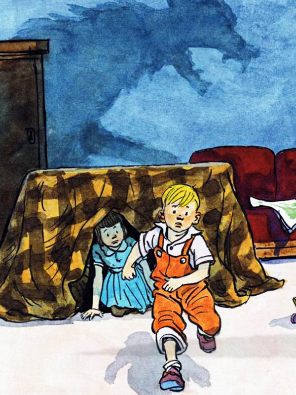 Рассказ о мальчике и девочке, которые прочитали сказку Три поросенка и решили построить себе домик из одеял и стульев. И вдруг мальчику показалось, что его за ногу схватил серый волк…