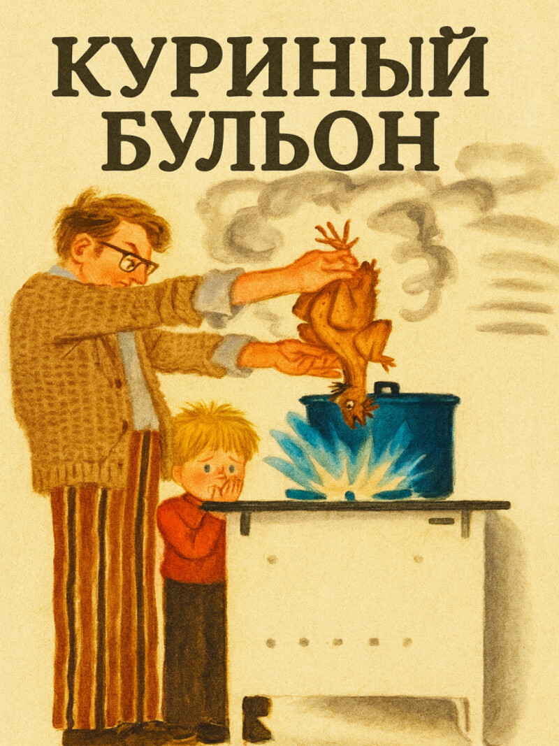 Рассказ о том, как Дениска с папой пытались сварить курицу: ее надо было сначала ощипать и опалить над горелкой. Но курица стала совсем черная. Они ее мыли с мылом и она выскользнула под шкаф.